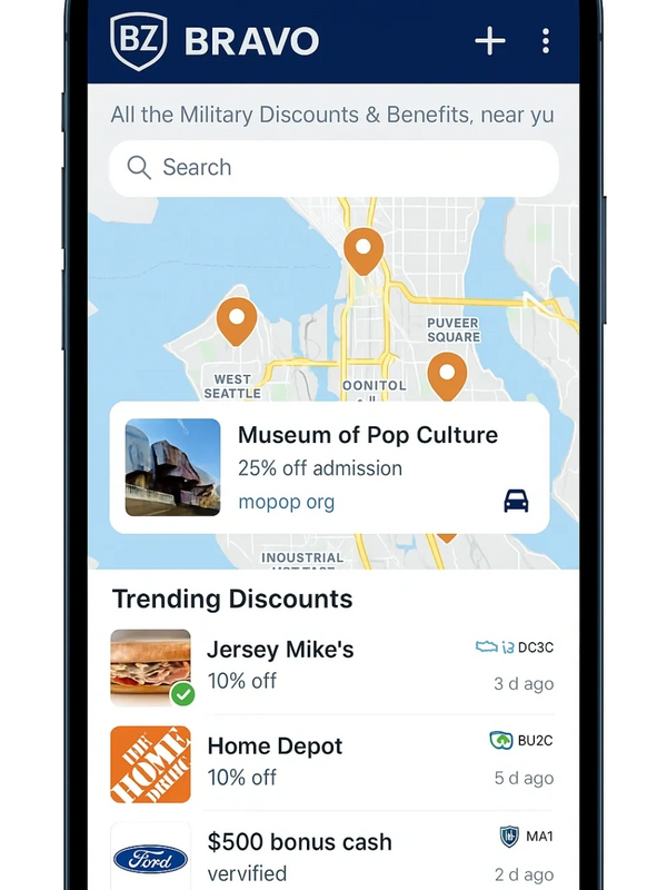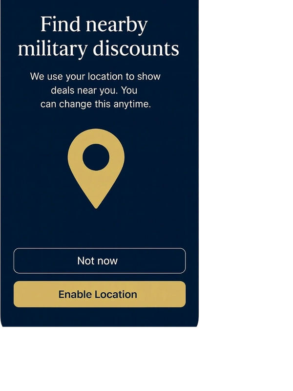 Use our map-based app to discover deals at restaurants, shops, and services near you. No more searching through cluttered websites or wondering which businesses actually honor military discounts. Just open the app, see what's nearby, and save.